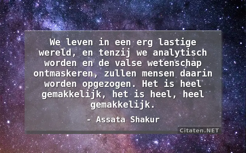 We leven in een erg lastige wereld, en tenzij we analytisch worden en de valse wetenschap ontmaskeren, zullen mensen daarin worden opgezogen. Het is heel gemakkelijk, het is heel, heel gemakkelijk. van : Assata Shakur
