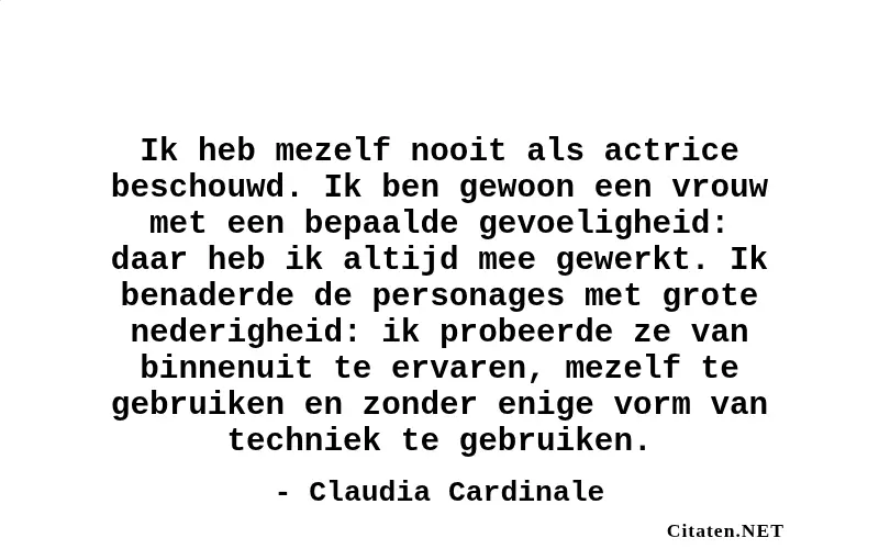 Ik heb mezelf nooit als actrice beschouwd. Ik ben gewoon een vrouw met een bepaalde gevoeligheid: daar heb ik altijd mee gewerkt. Ik benaderde de personages met grote nederigheid: ik probeerde ze van binnenuit te ervaren, mezelf te gebruiken en zonder enige vorm van techniek te gebruiken. van : Claudia Cardinale