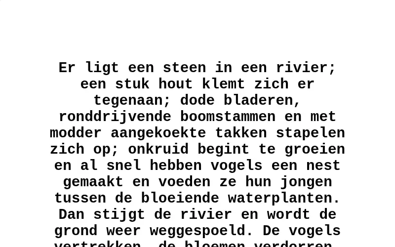 Origineel:A stone lies in a river; a piece of wood is jammed against it; dead leaves, drifting logs, and branches caked with mud collect; weeds settle there, and soon birds have made a nest and are feeding their young among the blossoming water plants. Then the river rises and the earth is washed away. The birds depart, the flowers wither, the branches are dislodged and drift downward; no trace is left of the floating island but a stone submerged by the water; - such is our personality.