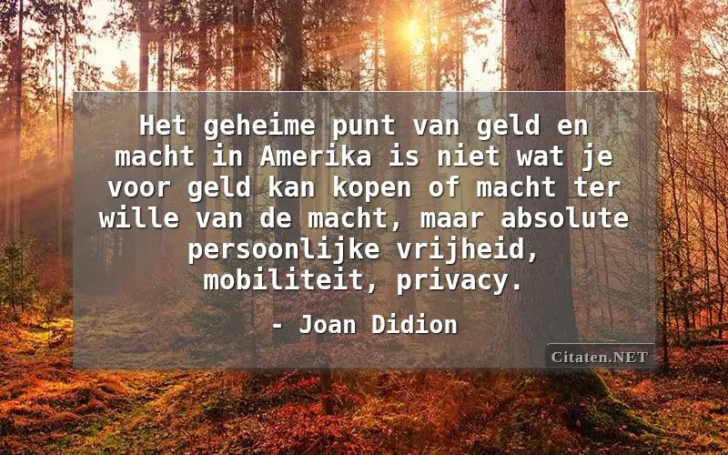 Het geheime punt van geld en macht in Amerika is niet wat je voor geld kan kopen of macht ter wille van de macht, maar absolute persoonlijke vrijheid, mobiliteit, privacy. van : Joan Didion