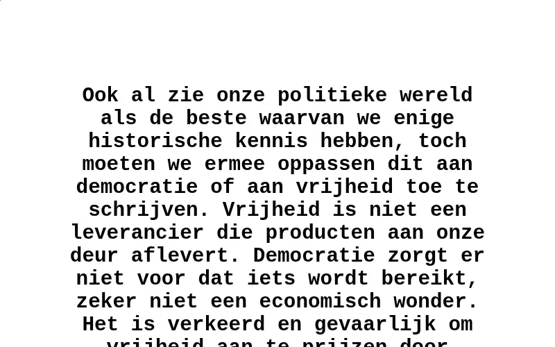 Origineel:Although I consider our political world to be the best of which we have any historical knowledge, we should beware of attributing this fact to democracy or to freedom. Freedom is not a supplier who delivers goods to our door. Democracy does not ensure that anything is accomplished — certainly not an economic miracle. It is wrong and dangerous to extol freedom by telling people that they will certainly be all right once they are free.