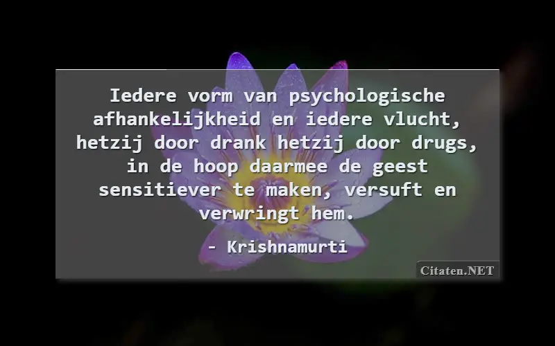 Iedere vorm van psychologische afhankelijkheid en iedere vlucht, hetzij door drank hetzij door drugs, in de hoop daarmee de geest sensitiever te maken, versuft en verwringt hem. van : Krishnamurti