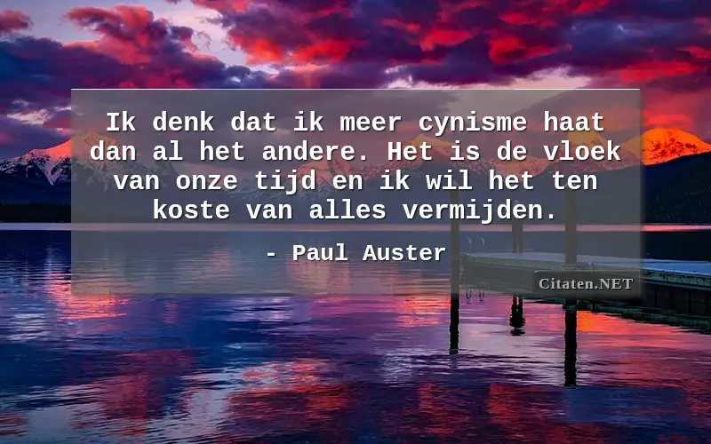Ik denk dat ik meer cynisme haat dan al het andere. Het is de vloek van onze tijd en ik wil het ten koste van alles vermijden. van : Paul Auster